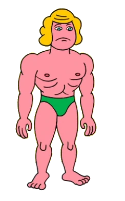 Crispin Mulcahy appears to be a very miniature tiny muscular man with blond hair and a green speedo.
