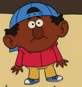 Eric is a dark-skinned boy with curly black hair. He wears a red jacket, dark yellow pants, a blue cap, and matching blue-and-white sneakers.