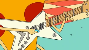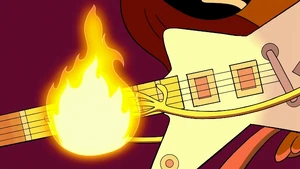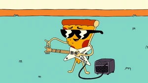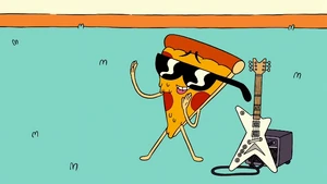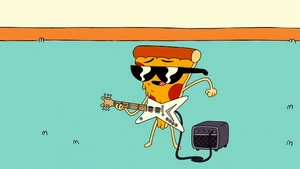 Uncle Grandpa asked Pizza Steve if he wanted to play the song he was working on. Pizza Steve bragged about the song being "platinum-titanium" and already having a large following with pre-orders as he picked up the guitar. Then he had another vision. He imagined himself with rockstar hair standing on top of a large speaker. He began to play his awesome music very loudly before fire enveloped the speaker from his "awesome" guitar playing skills. The fire shot out at Uncle Grandpa and Uncle Grandpa flew back and right out of the RV. Pizza Steve immediately stopped playing to see if Uncle Grandpa was okay. Uncle Grandpa was beaten and battered just like he was when he came through the time portal and told Steve he had lost all respect for him, just like in the last vision. Pizza Steve snapped to reality and immediately told Uncle Grandpa that he wanted to do a few tweaks to his song before publicly releasing it.