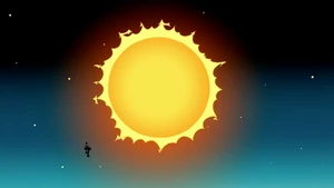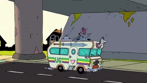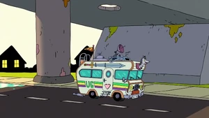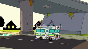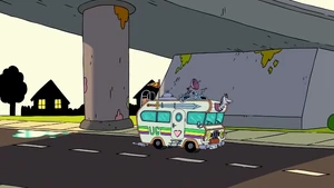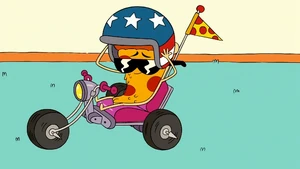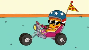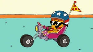 Uncle Grandpa then suggested that Pizza Steve shows him his awesome speed-cycle skills. Pizza Steve is ready to oblige as Uncle Grandpa hands him his helmet before Pizza Steve gets another vision. This vision shows Pizza Steve drive his speed cycle very fast towards the ramp Uncle Grandpa set down. He drives so fast that he propels himself straight into the air. He flies right out of the roof of the RV and all the way up the sky. He goes so high he reaches outer space, jumps over the sun, and flies straight back down. He lands by crashing right into Uncle Grandpa and blowing up the entire RV. He sits on his speed cycle on top of Uncle Grandpa within a crater. Pizza Steve looks down at Uncle Grandpa frantically and asks him if he's okay. Again, Uncle Grandpa is beaten and battered and tells him he has lost all respect for him.