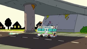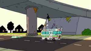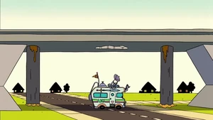 - There's a hole in the overpass at the end of the episode despite Pizza Steve not really doing an awesome jump.