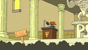Pizza Steve snaps back to reality, takes off his helmet, and starts to run away. When Uncle Grandpa asks where he's going, Pizza Steve tells him that he can't do any of that "awesome" stuff for Uncle Grandpa anymore. Uncle Grandpa becomes concerned and tells Pizza Steve that he respects Pizza Steve for all the "cool and awesome" stuff he does. Pizza Steve stops running away and has another vision. This vision shows him at a podium in front of a bunch of concerned people. Pizza Steve sadly tells the crowd that he must retire from doing awesome stuff. The crowd gasps before Uncle Grandpa screeches "NO" at the top of his lungs. Everyone watches as Uncle Grandpa proceeds to beat himself up with a sign. Pizza Steve frantically rushes over to Uncle Grandpa and asks him if he's okay. Uncle Grandpa looks up at him, beaten and battered, and tells him that he has lost all respect for him.