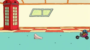Pizza Steve goes back to reality and immediately rushes to do all the things he was reluctant to do out of concern for Uncle Grandpa. He did his super kick, which merely only jiggled Uncle Grandpa's butt cheek a little. He did his guitar solo, which was just a bunch of random notes played randomly. He then put his helmet on and jumped on his speed cycle and drove up the ramp, but he merely only made the speed cycle lean down againt the end of the ramp. Pizza Steve took his helmet off and went running to Uncle Grandpa asking if Uncle Grandpa was disappointed. Uncle Grandpa gasped in shock, and revealed to Pizza Steve that the only way he would ever be disappointed in Steve is if Steve thought Uncle Grandpa could ever be disappointed in Steve.