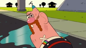 Pizza Steve is left stunned as the portal closes up and the Present Uncle Grandpa comes back from the kitchen and asks to see the super kick move Pizza Steve bragged about earlier. Pizza Steve was almost ready to show him when he suddenly had a doubt. He imagined himself doing his awesome karate kick and kicking Uncle Grandpa in the butt. When he kicked Uncle Grandpa, Uncle Grandpa went flying around the RV and got himself all beaten and battered like the way Future Uncle Grandpa looked. Pizza Steve frantically went to see if Uncle Grandpa was alright, but Uncle Grandpa told him that he lost all respect for him. After that thought, Pizza Steve backed out of doing the super kick.