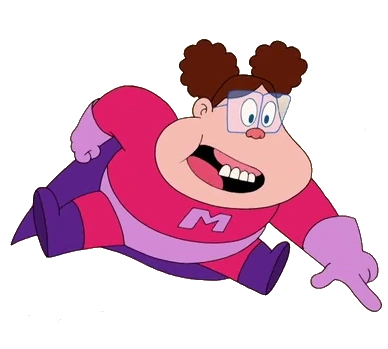 As Majestico, she is still plump with curly brown hair, but instead of her regular clothes she wears a pink spandex suit with a light purple M on the front, light purple gloves, a light purple speedo, a dark purple cape, and dark purple boots.