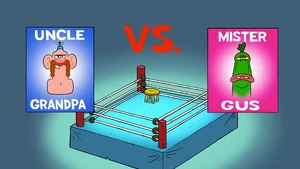 After training both of them for the match, the match begins. It's a very heated fight that goes back and forth with both Uncle Grandpa and Mr. Gus evenly matched. Some points Uncle Grandpa looked like he was winning and other points Mr. Gus looked like he was winning. Several crazy leg wrestling moves and a commercial later, Uncle Grandpa and Mr. Gus accidentally tangle up their legs together. This gives Pizza Steve the opportunity he needed to steal the TV remote and watch his own television show Oven Lovin'. Mr. Gus and Uncle Grandpa realize they have been tricked and conned out of watching TV.