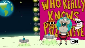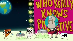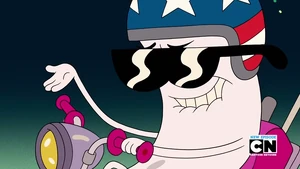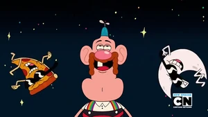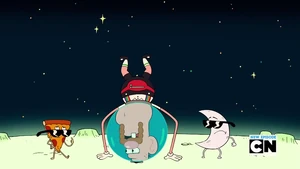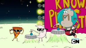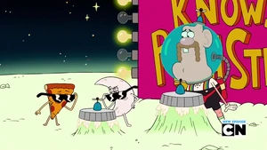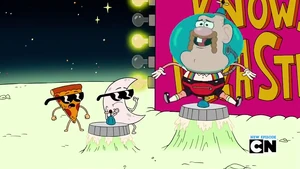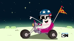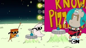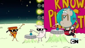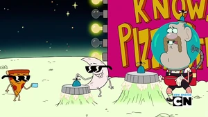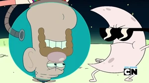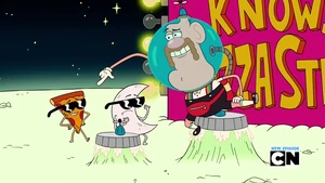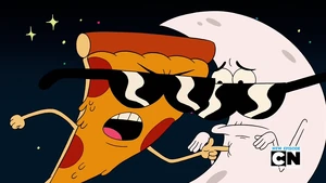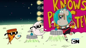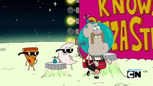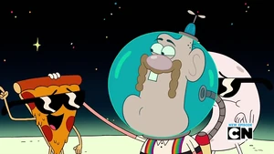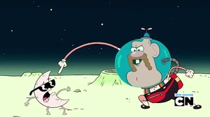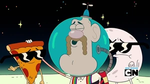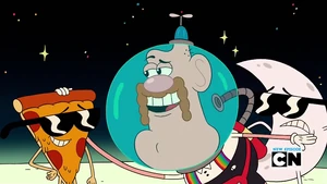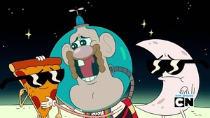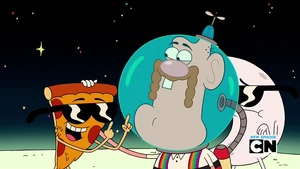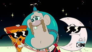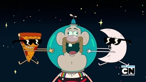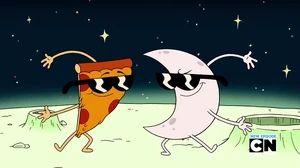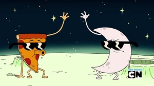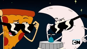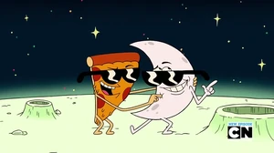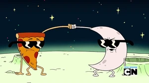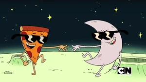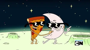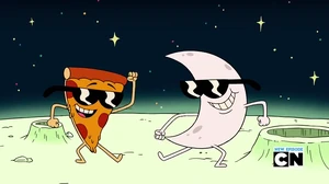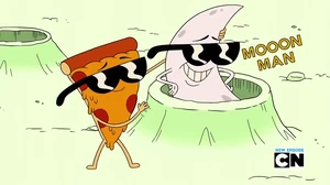 Mooon Man is a character that first appeared in "Bezt Frends". He is a crescent moon creature that lives on the Earth's moon. In Bezt Frends, he was befriended by Pizza Steve after Uncle Grandpa sent him to the moon. Uncle Grandpa was jealous of this friendship and challenged him to a Pizza Steve trivia game where the winner claims Steve as their best friend. Though Mooon Man had much better knowledge of Pizza Steve's hobbies and interests, Uncle Grandpa won by affirming that Pizza Steve is the coolest guy in the universe (Mooon Man stated that it was himself). Their friendship ended after Pizza Steve's rejected him for getting the final question of the game wrong. However, at the end of the very next episode (Food Truck), Pizza Steve expresses interest in buying the moon for $400 million. Though it would be far out of his price range, this suggests Pizza Steve has some intention of returning to the moon and reuniting with Mooon Man. He is voiced by Tone Loc.