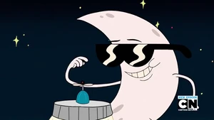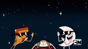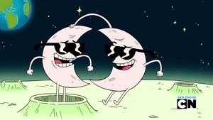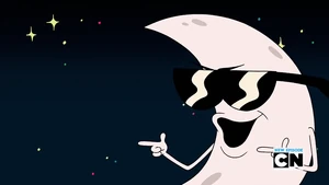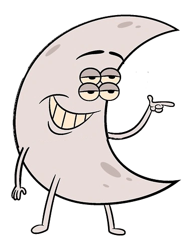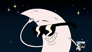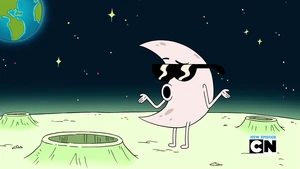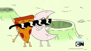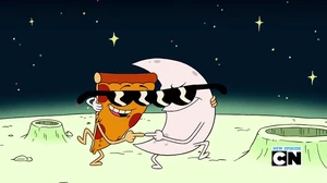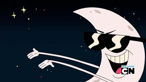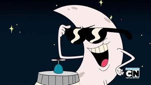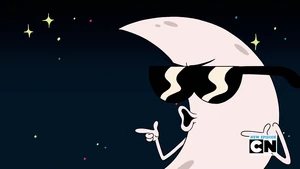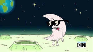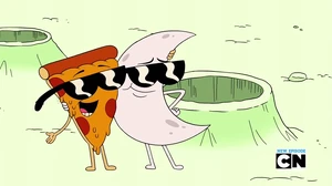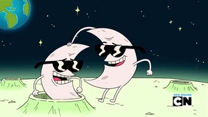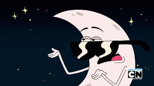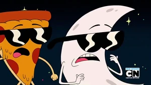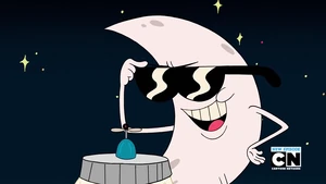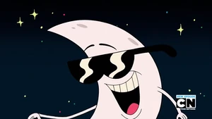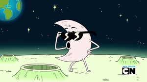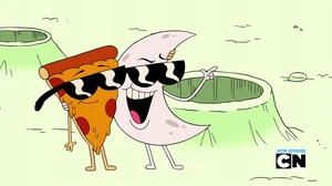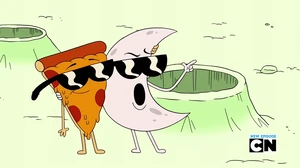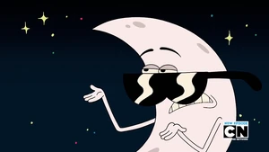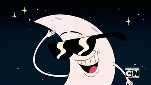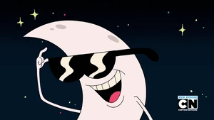 Mooon Man is a crescent moon with tiny arms and legs. He wears sunglasses and is about the same height as Pizza Steve. Without his sunglasses on, he literally has four eyes.