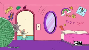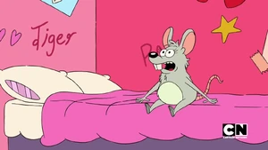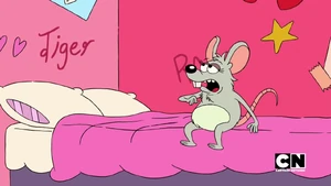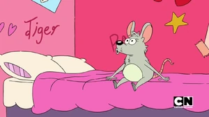 The mouse yells out for help and Uncle Grandpa gets surprised that the mouse can talk and he blows up and flies towards Tiger and Mouse then Mr. Gus comes and inflates Uncle Grandpa. Uncle Grandpa says he can't stand it when people don't get along, Mouse tells Uncle Grandpa to help her and that Tiger wants to eat her. Uncle Grandpa questions why Tiger would want to eat a little mouse and he begins to lick Mouse saying that's disgusting. Mouse tells Tiger to not eat me girlfriend and Uncle Grandpa gets the idea to make Tiger and Mouse best friends so he puts them in Tiger's room and he demands them to become best friends. Mouse notices that Tiger is a fan of English Muffinz too, and Mouse says how dreamy he is, and the two begin to gossip about him, they start to talk about fashion and they start doing makeovers. They start to do girl stuff like texting makeovers, going online, and playing spin the bottle.