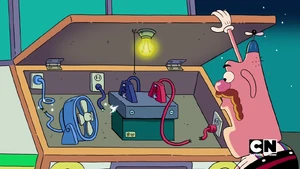 In Tiger's room Mouse is telling Tiger that she doesn't have to use a litter box anymore and that the world is her bathroom then Uncle Grandpa asks if they like surprises and tells them to follow him a surprise they're going to love. Uncle Grandpa asks them if they're ready for this surprise and they're excited for it, the elevator won't open since someone has chewed through the electrical system and Mouse begins to laugh about it. Uncle Grandpa pulls the doors open to reveal English Muffinz behind the door, Tiger and Mouse are love-struck to see that it was English Muffins and Uncle Grandpa tells the girls that he wants to spend the night with only one of them and he tells them to decide who should go.