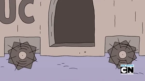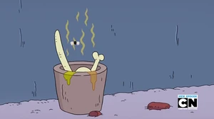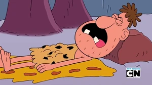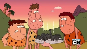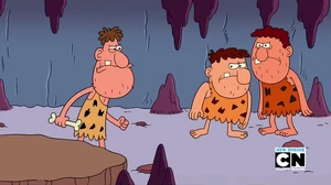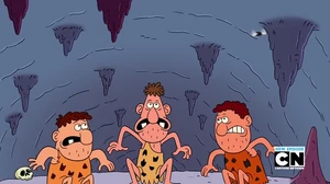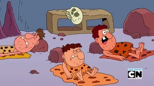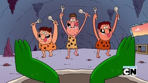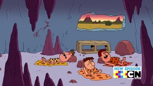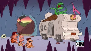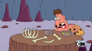 Uncle Caveman tells Breakfast to come back and Breakfast tells him to stop calling him that, Breakfast hijacks the Stone RV and drives off, this angers the other cavemen and Uncle Caveman promises to catch Breakfast for them, he then dashes off after Breakfast. Inside the Stone RV, Breakfast is not finding that the square tires don't make for a smooth ride, Uncle Caveman tells Breakfast that it's a shame that he'll devoured by hungry cavemen because he makes an excellent driver, Breakfast tells Uncle Caveman that he'll be able to drive better if he was able to see through the windshield and Uncle Caveman considers it. The Stone RV crashes out of the side of a mountain and shatters on the ground, Breakfast makes a run for it when he's on the ground.