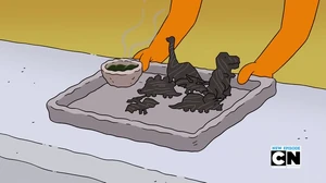 Uncle Caveman tells the cavemen that he know that he promised a nice dinosaur earlier and that now he's got something even better and a whole lot sweeter, he then presents delicious dino-nuggets which is a healthy alternative to dinosaur meat and to add more flavor they can dip a nugget in tar-tar sauce. He feeds on of the cavemen and he becomes satisfied along with the other cavemen, Uncle Caveman allows them to dig in, Breakfast wonders if they'll ever find out that there's no nutritional value in it, Uncle Caveman tells him that the more they eat the less they'll think about it and this gives him an idea.