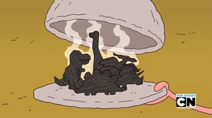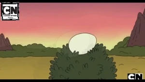 When Uncle Caveman tries to cook the egg, a green newborn dinosaur hatches and falls into the pot. The newborn asks what just happened, Uncle Caveman tells him that he's just been born and Congratulations! The newborn doesn't seem too impressed about it though. Uncle Caveman introduces himself to the newborn and names him "Breakfast", Breakfast is confused about his name and Uncle Caveman asks him if he can smell all the flavors from his flesh that's roasting for the hunger of the three hungry cavemen. Uncle Caveman proceeds to boil Breakfast and he pulls out a giant stone spatula and tells Breakfast that it's time to flip him over, Breakfast refuses that to happen and he smashes Uncle Caveman with the spatula and runs for it.