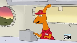 Breakfast grabs hold of a Pterodactyl's tail and Uncle Caveman tells him what are the odds that they're on the same flight, an airplane steward tell Uncle Caveman that they're all out of pretzels and this bums him out. Breakfast tells Uncle Caveman that there has to be something else that he can feed to the dumb cavemen, Uncle Caveman suggests like what, and Breakfast isn't sure and he tells Uncle Caveman that if he stops chasing him he can help Uncle Caveman figure something. This excites Uncle Caveman and he thanks Breakfast by trying to kiss him, Breakfast tries to make him stop and the Pterodactyl see them kissing and it grosses him out, so he kicks them off of his tail.