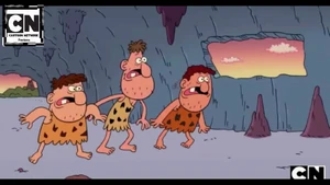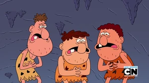 A prehistoric version of Uncle Grandpa pokes his head out from his cave opening and goes into a stance as if he's ready to fight the cavemen, he runs towards the cavemen until a stalagmite grabs hold of his head and brings it back, causing him to speak English.