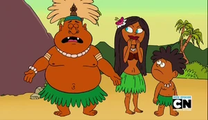 Uncle Grandpa decides to take his vacation on a deserted island 2000 miles away from civilization, and many things on the island resemble Uncle Grandpa's head. Uncle Grandpa sets up a hammock and begins to eat all 10,000 hot dogs, until an island lady comes out of nowhere and tells Uncle Grandpa that he is the chosen one and begins to worship him, and she tells him that he came to the island to save the island, but Uncle Grandpa doesn't believe her and says that she has him confused with someone else and that he's just here to enjoy his vacation. The island lady says that he's here to help but Uncle Grandpa says that normally he loves helping people out with stuff but he's on vacation, and then he goes water skiing, the island lady goes to warn the others. Next Uncle Grandpa goes ziplining while eating hot dogs, then an island kid comes and calls Uncle Grandpa the chosen on and says that at the base of the mountain he'll drink from the ceremonial coconut and save the island, but Uncle Grandpa refuses to do so and sticks hot dogs in his ears to tune him out and tells the kid that he's on vacation. Uncle Grandpa then prepares to go scuba diving and fills an oxygen tank with hot dogs, and says that if he can't have his vacation he wouldn't have shown up at the island in the first place, so Uncle Grandpa dives in and eats hot dogs while scuba diving, he then swims in a cave that looks like his face and thinks that no one will find him in there, he begins to eat a hot dog but an island guy takes it away and says that there is no time for food and that the island needs help now. The island guy brings out a scroll that shows Uncle Grandpa protecting the island, Uncle Grandpa says that he wishes that he could draw like that, but Uncle Grandpa continues to say that if it was him, then why isn't he enjoying a vacation, and that he's only here to enjoy a vacation, the guy says vacation later, help now. He gives Uncle Grandpa the ceremonial coconut and the island spirit will save the island.