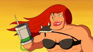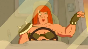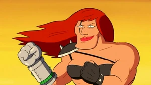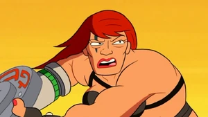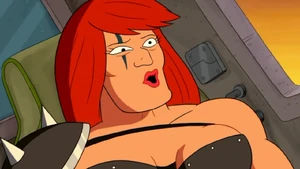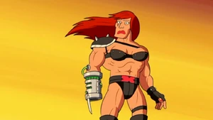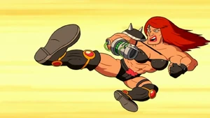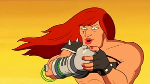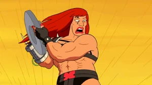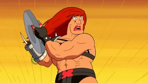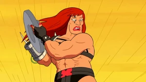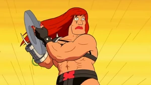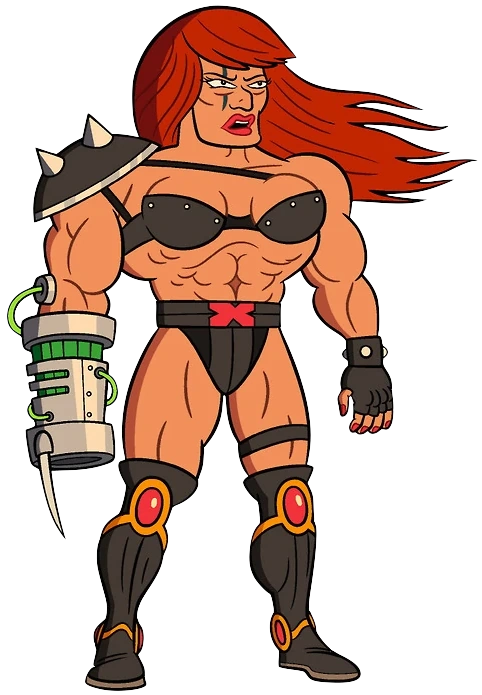 She is a muscular warrior who has red hair, a scar over her left eye, manly voice and a metal part where one of her hands should be. The metal part on her hand has many accessories and attachments that she uses during battles. Her right foot is also cybernetic and can be used as a machine gun. She wears a black bikini with knee high black boots and a singular piece of shoulder armor with spikes on top.